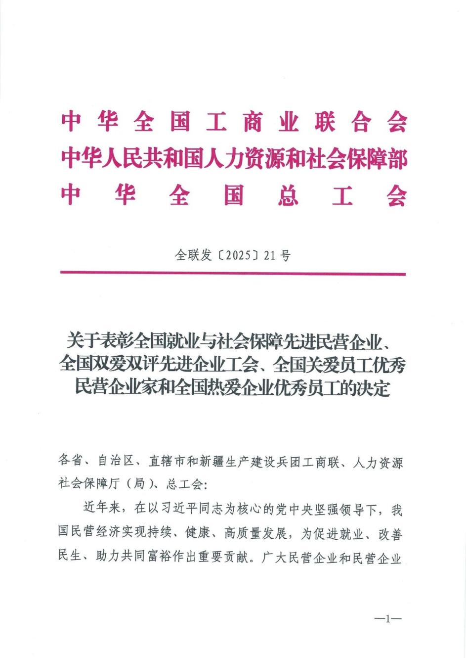 近日,由中华全国工商业联合会、人力资源和社会保障部、中华全国总工会联合印发的《关于表彰全国就业与社会保障先进民营企业等先进典型的决定》(全联发〔2025〕21 号)正式公布,浙江云中马股份有限公司凭借在稳定就业、完善社保体系、构建和谐劳动关系等方面的突出贡献,荣获 “全国就业与社会保障先进民营企业”称号!这一国家级荣誉,不仅是对云中马践行 “以员工为本” 理念的肯定,更是对其作为制造业民企 “稳就业、保民生” 社会责任的生动注解。